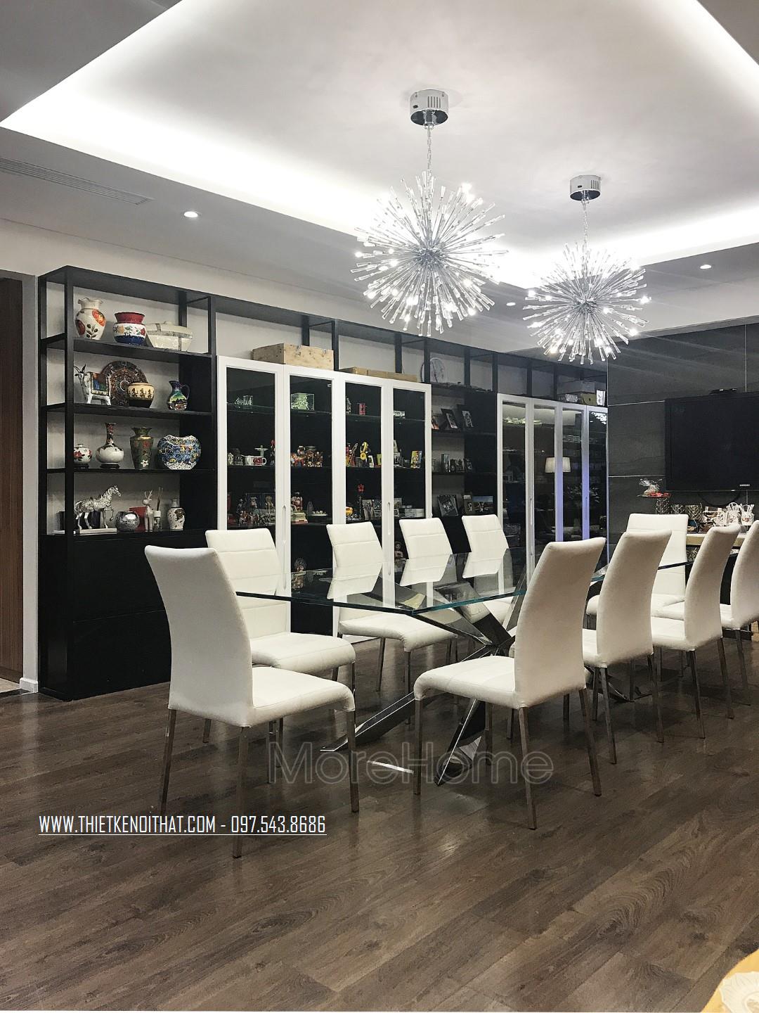 Thi công phòng ăn hiện đại với hệ bàn ăn 8 ghế với chất liệu da chân inox tạo sự rắn chắc cho người ngồi. Chiếc bàn ăn được thiết kế với mặt kính cường lực chân inox tạo nên sự tinh tế, hiện đại cho không gian phòng ăn. Không những mẫu bàn ghế ăn sang trọng mà chiếc đèn chùm hình tia pháo cũng làm cho không gian phòng ăn thêm lãng mạn hơn.