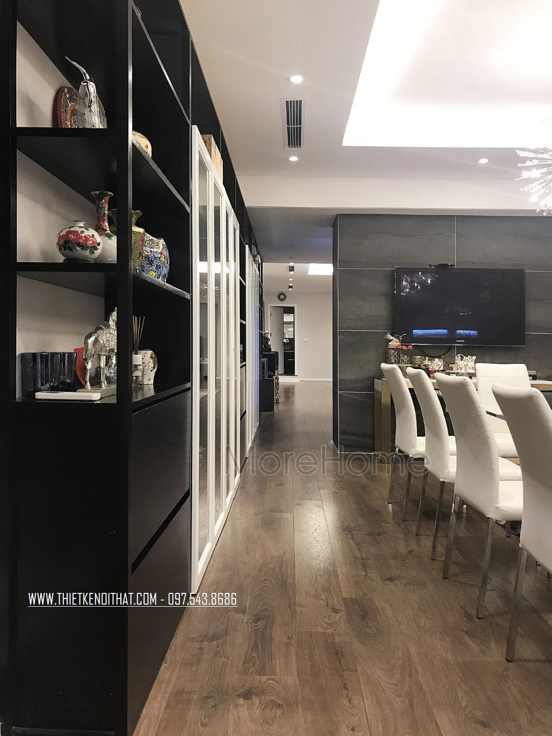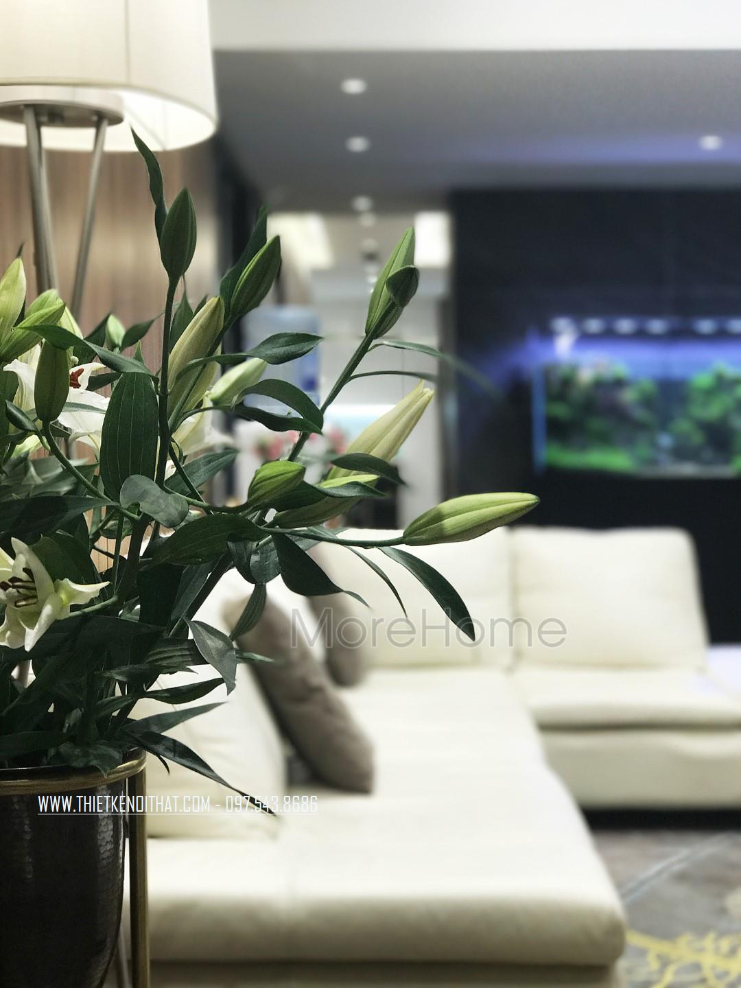Thi công nội thất phòng khách: KTS chọn sự tối giản nhất cho phòng khách. Bộ sofa giữ chức năng chính trong không gian phòng khách này, sofa được chọn với chất liệu da, tone màu trắng tạo nên sự tinh tế nổi bật giữa không gian phòng. Đi sâu vào trong của phòng khách KTS đã thiết kế cho gia chủ bộ kệ trang trí với tone màu trắng đen và chất liệu sắt là chủ yếu. Chiếc kệ được đặt mép tường kéo dài từ phòng khách đi vào hướng các không gian phòng phía trong. Kệ trang trí được thiết kế với công năng sử dụng là để sách, túi và vật dụng cá nhân của gia chủ.