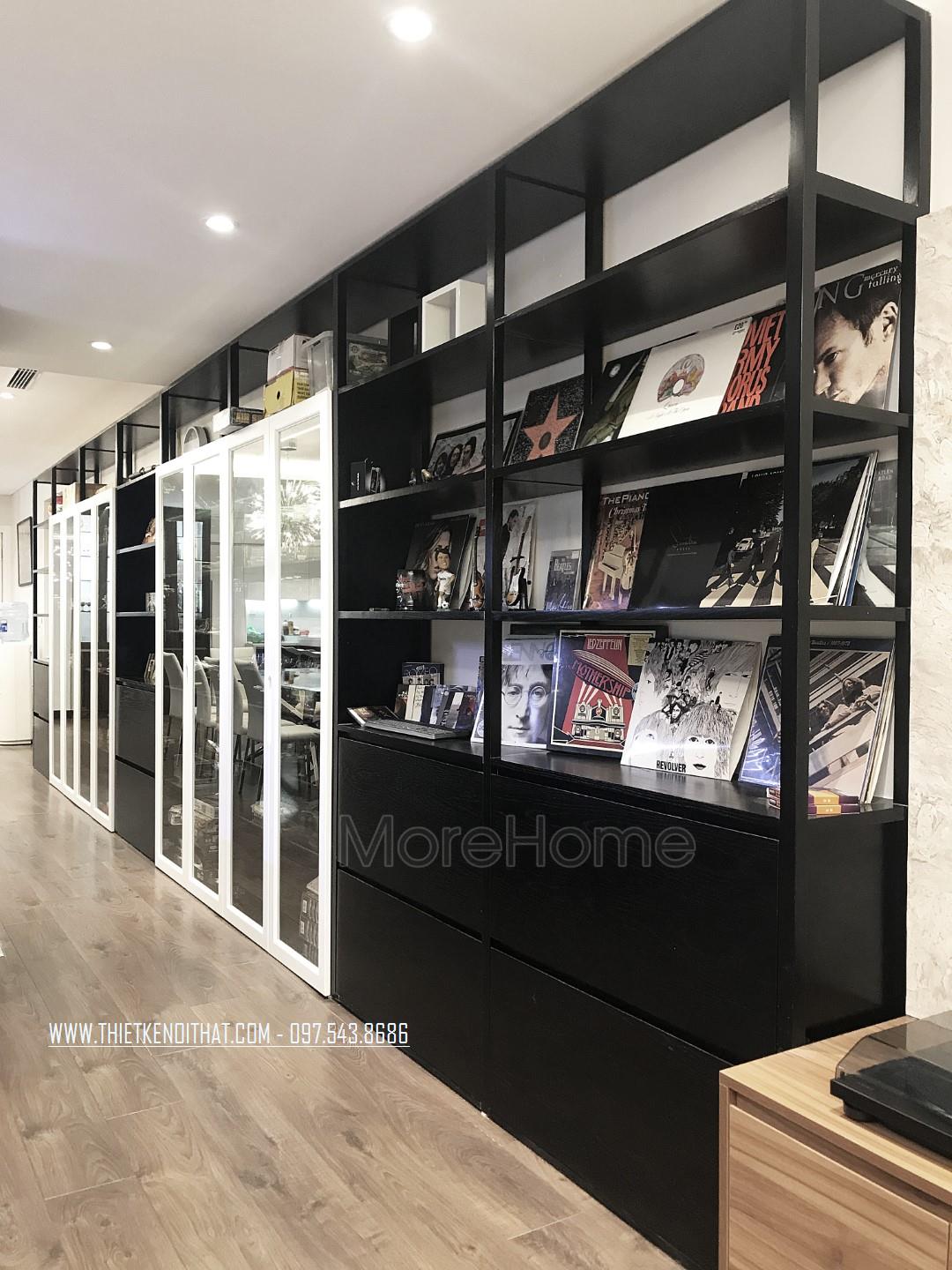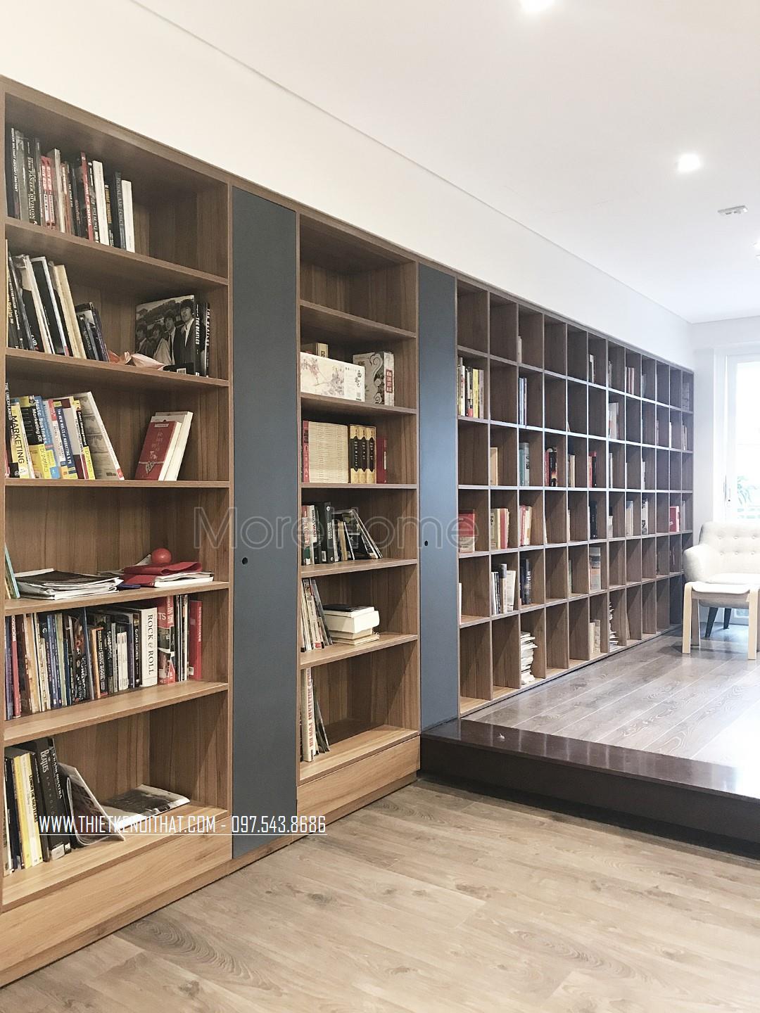 Đi sâu vào bên trái là phòng đọc sách, với hệ tủ sách bằng gỗ công nghiệp tạo cho gia chủ có không gian lưu trữ sách vô tận. Bên cạnh đó KTS thiết kế một chiếc bục bằng gỗ nhằm và một chiếc ghế thư giãn nhằm tạo không gian đọc sách riêng cho gia chủ.