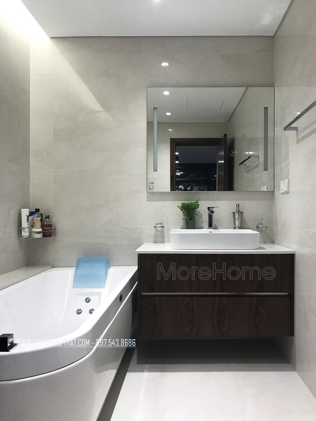 Phòng tắm được thiết kế khá đầy đủ đồ nội thất và thiết bị vệ sinh. Mẫu phòng tắm này cũng sử dụng vách ngăn kính cường lực để ngăn không gian vệ sinh với không gian tắm. Sự tinh tế mà vách kính cường lực mang lại kết hợp với sự đa năng của thiết bị vệ sinh tạo nên không gian thư giãn tuyệt vời cho gia chủ.