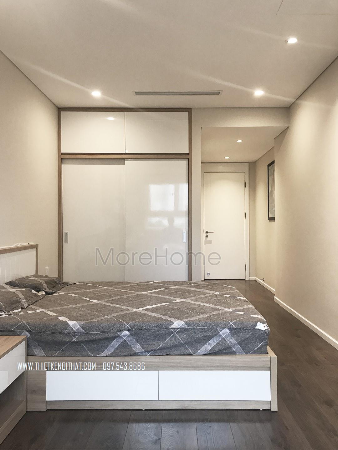 Phòng ngủ được thi công khá tối giản với mẫu đồ nội thất âm tường. Chiếc tủ áo với chất liệu gỗ verneer tối màu cửa trượt được thiết kế âm tường tạo sự đa năng nhất định cho người dùng. Kệ tivi phòng ngủ cũng được thiết kế âm tường giúp giải phóng không gian một cách tối ưu nhất. Bàn trang điểm kết hợp với bàn làm việc được thiết kế kéo dài từ của chính vào của sổ tạo nên một mảng tường với ứng dụng tuyệt vời nhất.