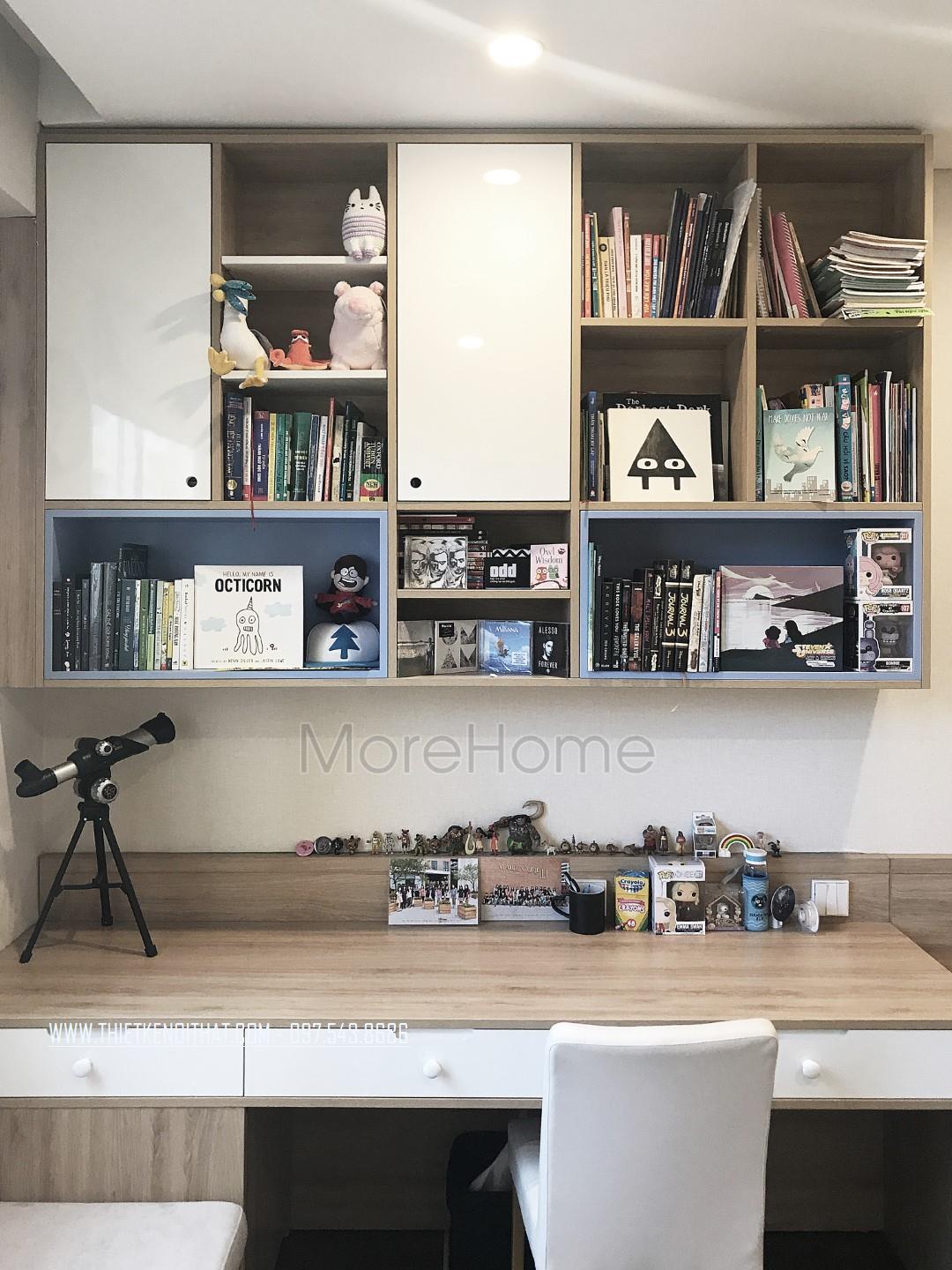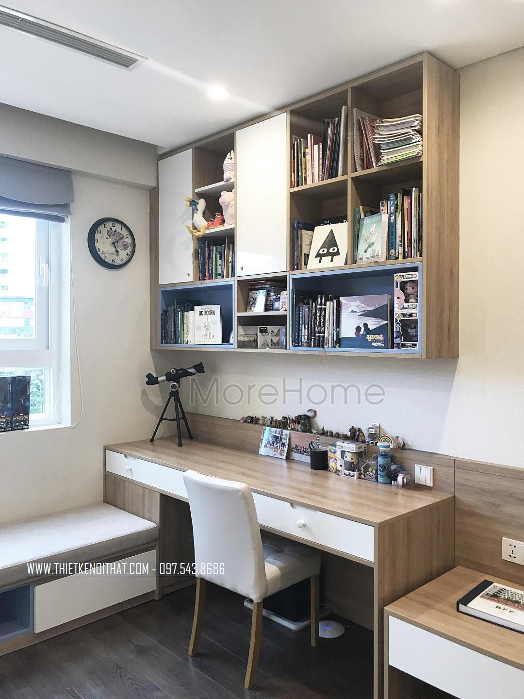Thi công phòng ngủ con khá hiện đại với mẫu bàn và kệ trang trí đặt sát của sổ. Vẫn là mẫu tủ áo gỗ công nghiệp âm tường, nhưng không gian phòng ngủ này khác hơn là được thiết kế khá sáng tạo và năng động.