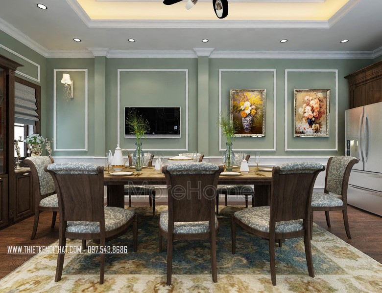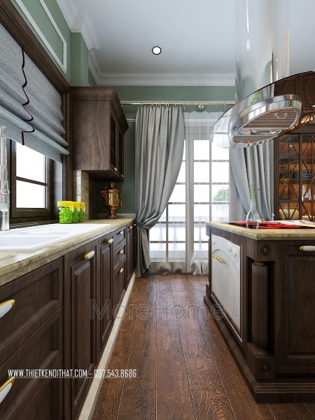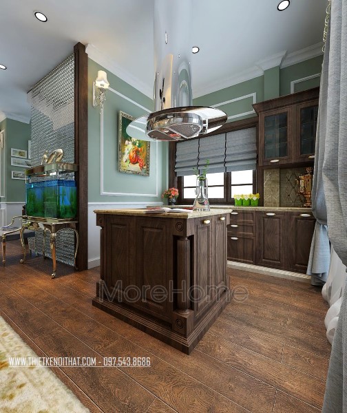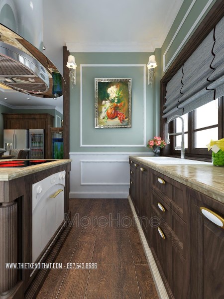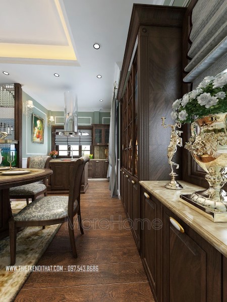 Thiết kế nội thất khu bếp phong cách tân cổ điển sử dụng gỗ tự nhiên tone màu veneer nâu trầm được sắp xếp gọn gàng, khoa học không tốn quá nhiều diện tích mà vẫn phát huy được tính năng vốn có. Hệ thống tủ gỗ kéo dài ở không gian bếp và bàn ăn giúp tăng tính công năng cho căn phòng, không chỉ vậy còn là một không gian trang trí ấn tượng, tạo điểm nhấn cho căn phòng.
