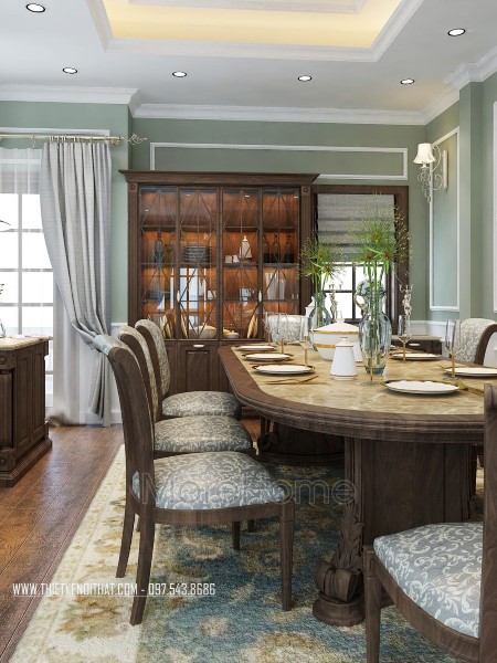 Tiếp đến là thiết kế nội thất không gian phòng bếp và bàn ăn liền kề. Thiết kế nội thất tân cổ điển nhấn mạnh vào đường nét và họa tiết trang trí cầu kỳ mang lại cho gia chủ cảm giác nhẹ nhàng và thanh thoát mang hơi hướng châu Âu cổ điển. Một trong chất liệu được kiến trúc sư ưu ái sử dụng chính là đá tự nhiên. Đây là một trong những chất liệu nhẹ được ưa chuộng những năm gần đây do tính linh hoạt và thẩm mỹ của nó. Đá tự nhiên với độ tương phản, tính mát giúp không gian trở nên tự nhiên, cân bằng sáng được đảm bảo.