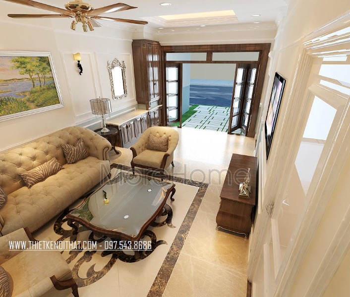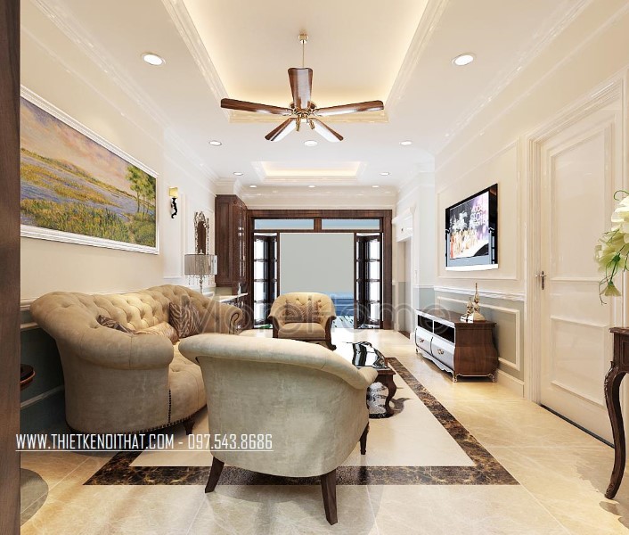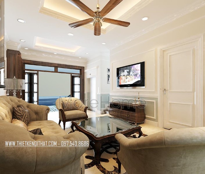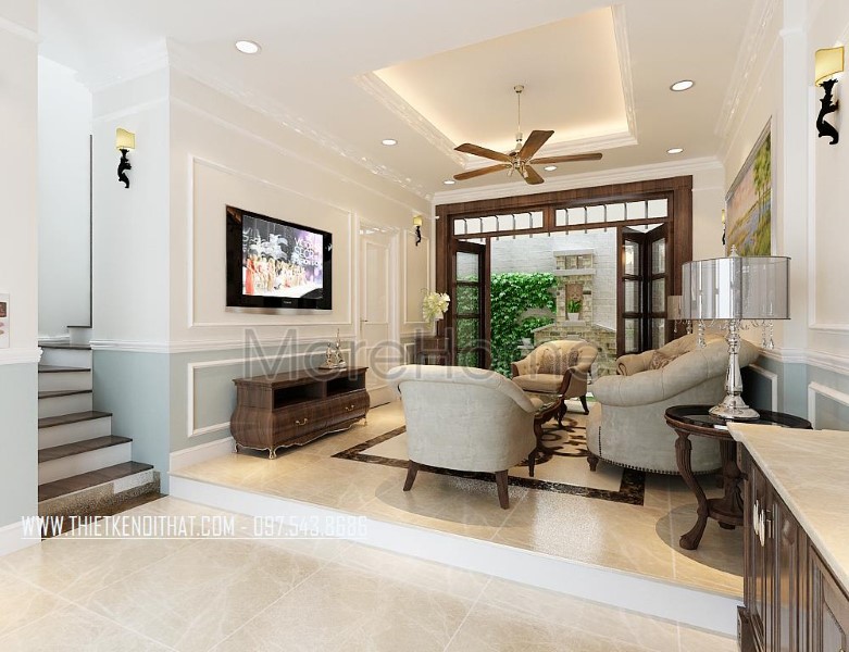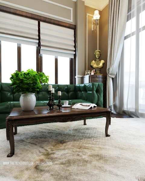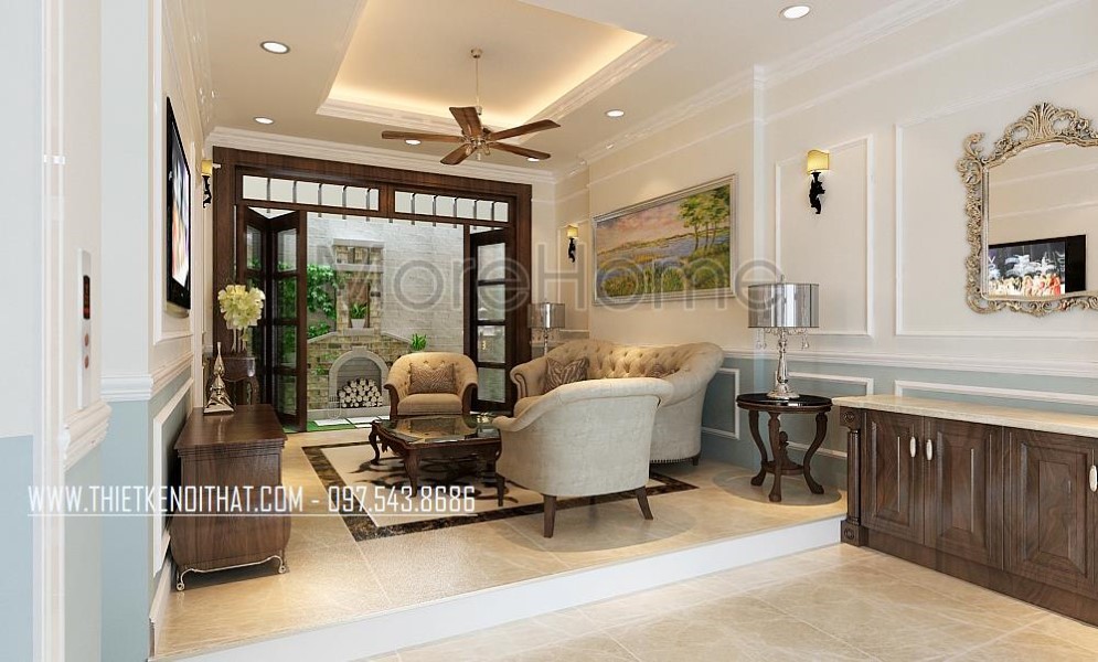 Thiết kế nội thất tân cổ điển tại phòng khách khá đơn giản. Nổi bật nhất ở không gian này chính là thiết kế ghế sofa to bành mang đến cảm giác an toàn và vững chãi cho căn nhà. Thay vì các thiết kế đơn giản, linh hoạt, không tốn diện tích thì thiết kế sofa này lại khá rộng rãi, phù hợp với các căn biệt thự cao cấp, các không gian chia cắt rõ ràng. Cửa ra vào được thiết kế cân bằng ở giữa, diện tích rộng mở và không có vật chắn giữa giúp mang lại ánh sáng tự nhiên và sự hứng khởi cho không gian.