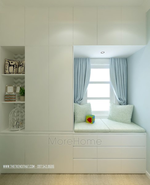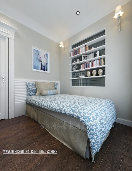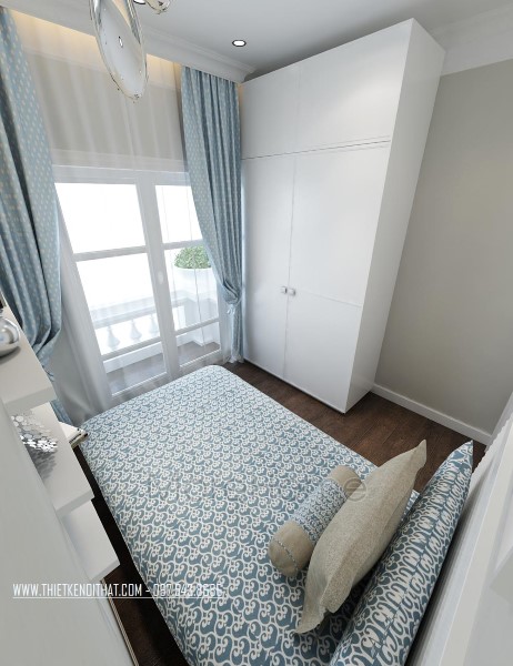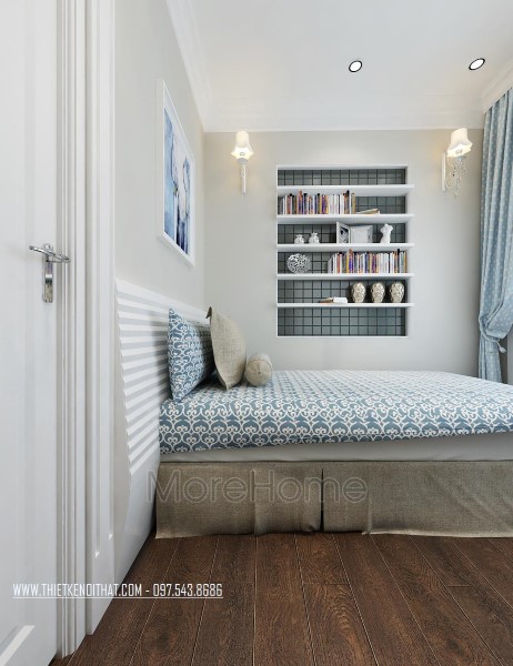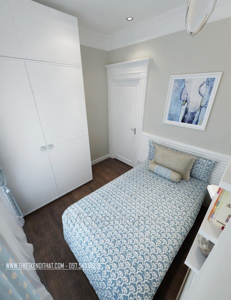 Thiết kế nội thất phòng ngủ khá đơn giản với tone màu trắng chủ đạo. Họa tiết trang trí đơn giản mang cảm hứng tân cổ điển tạo sự cân bằng về màu sắc và đường nét cho căn phòng. Điều đặc biệt trong căn phòng này chính là thiết kế kệ tủ âm tường, tuy căn phòng không quá rộng nhưng với các thiết kế đa năng và tủ âm tường, kết hợp với ánh sáng tự nhiên mà nó trở nên mở hơn rất nhiều,