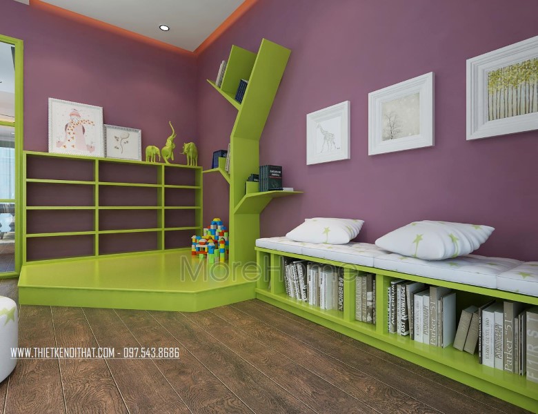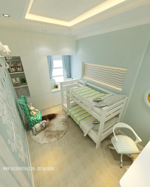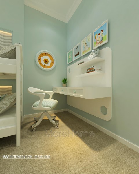 Cuối cùng là thiết kế phòng ngủ cho trẻ nhỏ với giường tầng đa năng.Thiết kế ngăn kéo đa năng kết hợp khéo léo với giường hay tủ gỗ là điểm nhấn công năng quan trọng giúp tiết kiệm diện tích căn phòng nhỏ. Thiết kế bàn học sáng tạo là điểm cộng lớn mang đến sự hào hứng cho trẻ nhỏ.