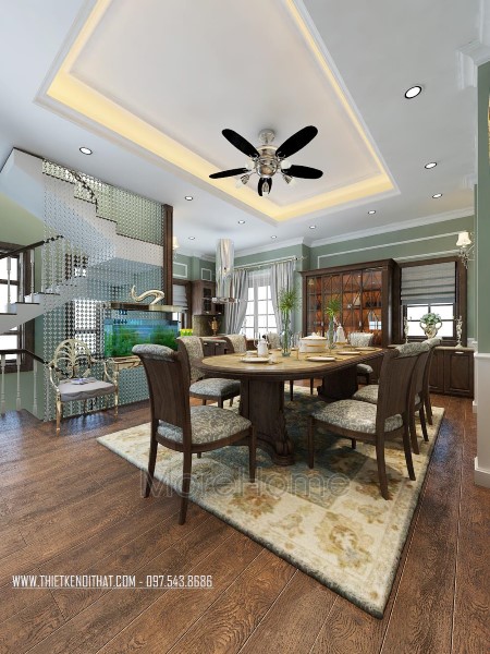 Ở thiết kế nội thất căn biệt thự Nguyễn Chí Thanh ta dễ dàng nhận ra tone màu mà kiến trúc sư sử dụng hầu hết là các tone màu trầm, tối, không nổi bật hay quá rực rỡ, vì vậy mang đến cảm giác ấm cúng và sang trọng. Tuy nhiên với thiết kế sử dụng tone màu trầm, không gian thường khá đơn điệu, không có sự cân bằng về màu sắc, chính lúc này, các đường cong trang trí tinh tế lại phát huy tác dụng của nó, làm mềm mại hóa không gian, tạo sự cân bằng cần thiết cho khu sinh hoạt chung.