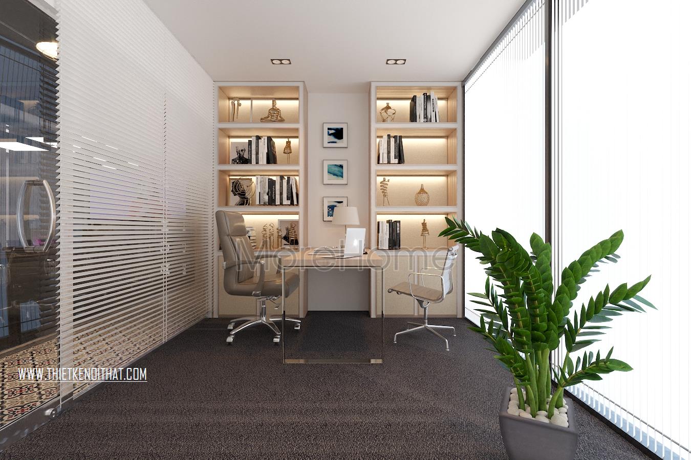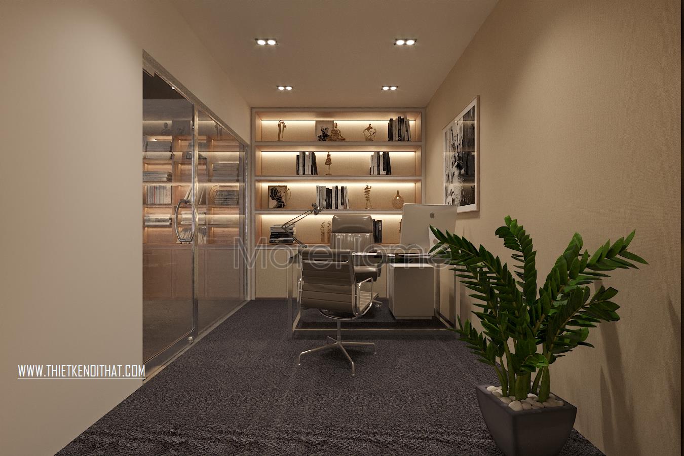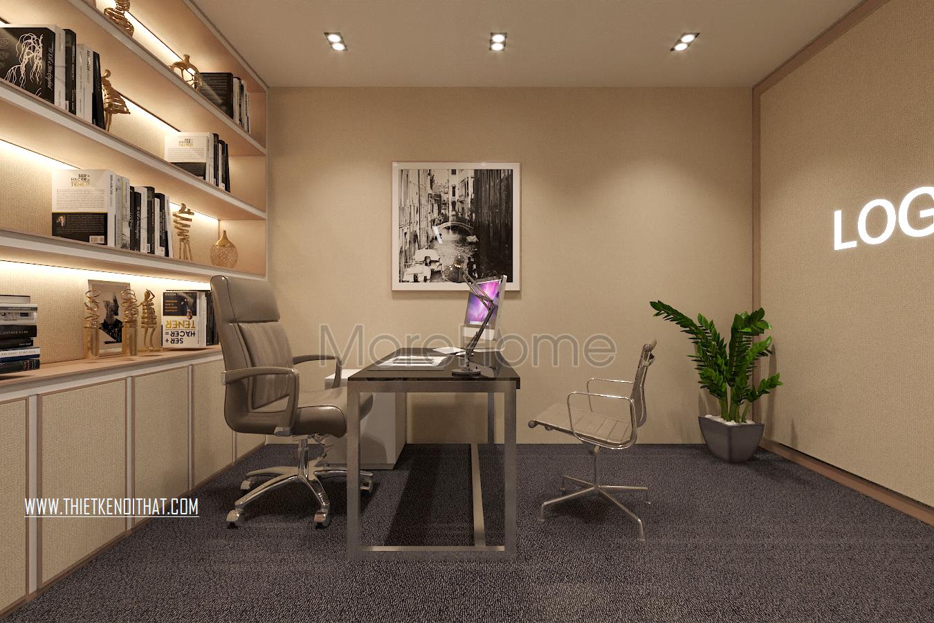Không gian phòng giám đốc tiêu chuẩn cần tối thiểu 15m2 cho mỗi phòng. Đối với thiết kế hiện đại, kiến trúc sư sử dụng kệ âm tường với chất liệu nhôm kính cao cấp vừa tăng khả năng lưu trữ đồ decor trang trí mảng tường vừa khiến tạo cảm giác không gian như rộng hơn thực tế. Phòng giám đốc sản phẩm được thi công với logo thương hiệu trên nền giấy dán tường tông nâu nhạt.