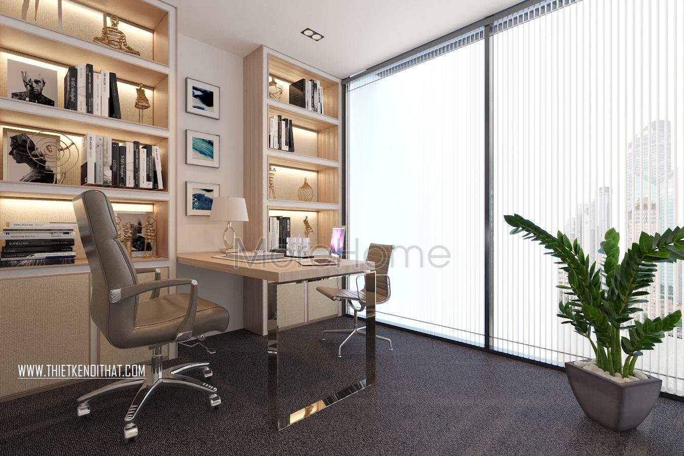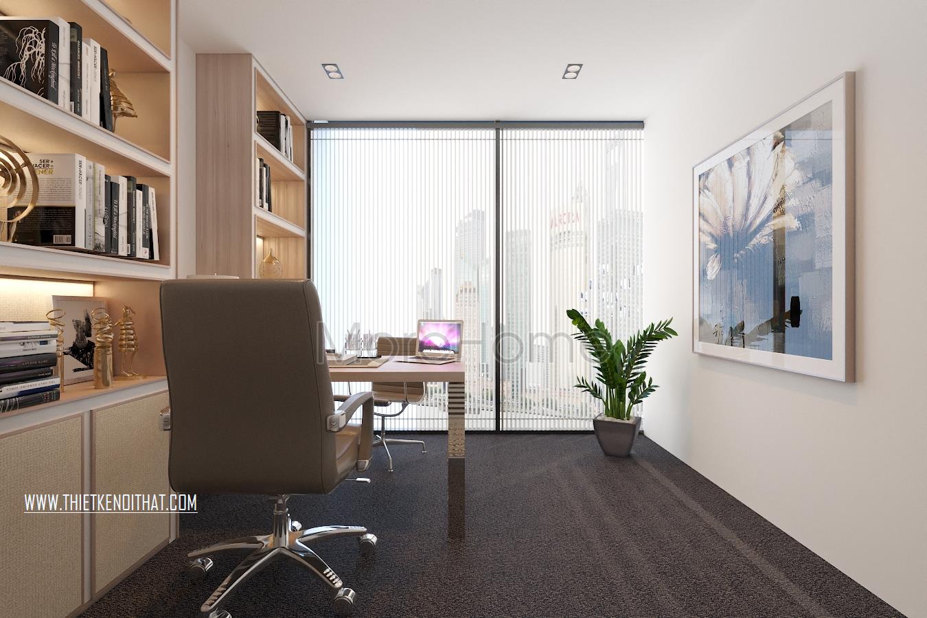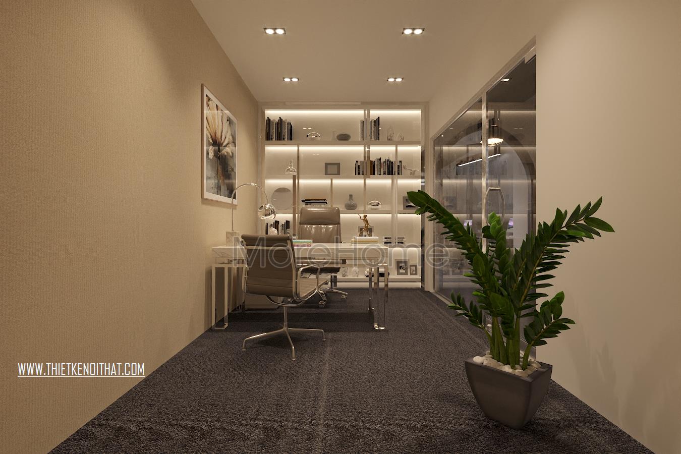Không gian phòng giám đốc tiêu chuẩn cần tối thiểu 15m2 cho mỗi phòng. Đối với thiết kế hiện đại, kiến trúc sư sử dụng kệ âm tường với chất liệu nhôm kính cao cấp vừa tăng khả năng lưu trữ đồ decor trang trí mảng tường vừa khiến tạo cảm giác không gian như rộng hơn thực tế. Phòng giám đốc sản phẩm được thi công với logo thương hiệu trên nền giấy dán tường tông nâu nhạt.