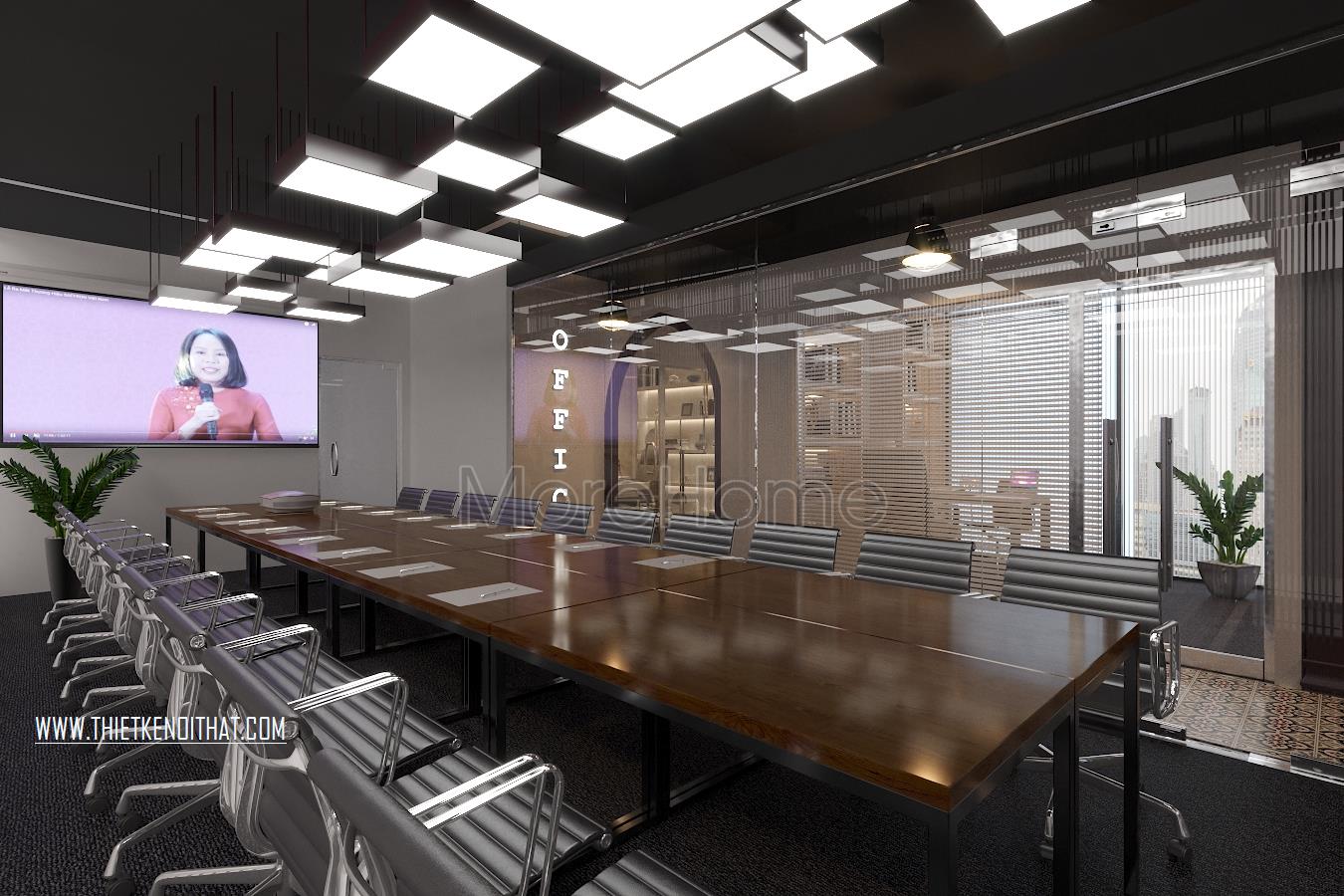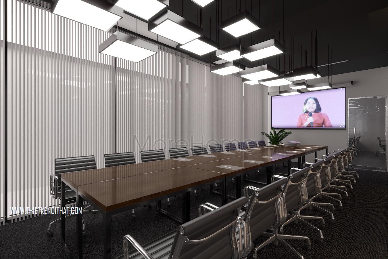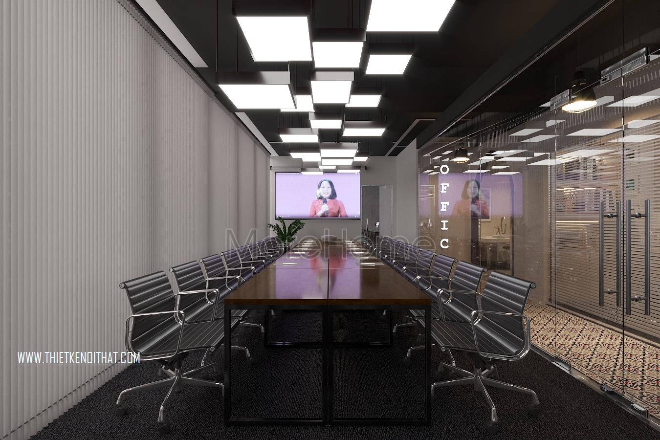Đây là khu vực chiếm diện tích tương đối lớn của văn phòng này 30m2 với sức chứa 20 người. Không gian phòng họp được thiết kế với hệ thống vách kính cường lực chống ồn, kiến trúc sư muốn sử dụng cửa kính thủy lực để thi công cho khu vực này. Bàn gỗ sồi màu nâu trầm chân thép hiện đại, đơn giản giúp giảm bớt được nhiều diện tích chiếm dụng mặt sàn. Hệ thống đèn trần thiết kế so le cho một không gian có độ sâu trần.