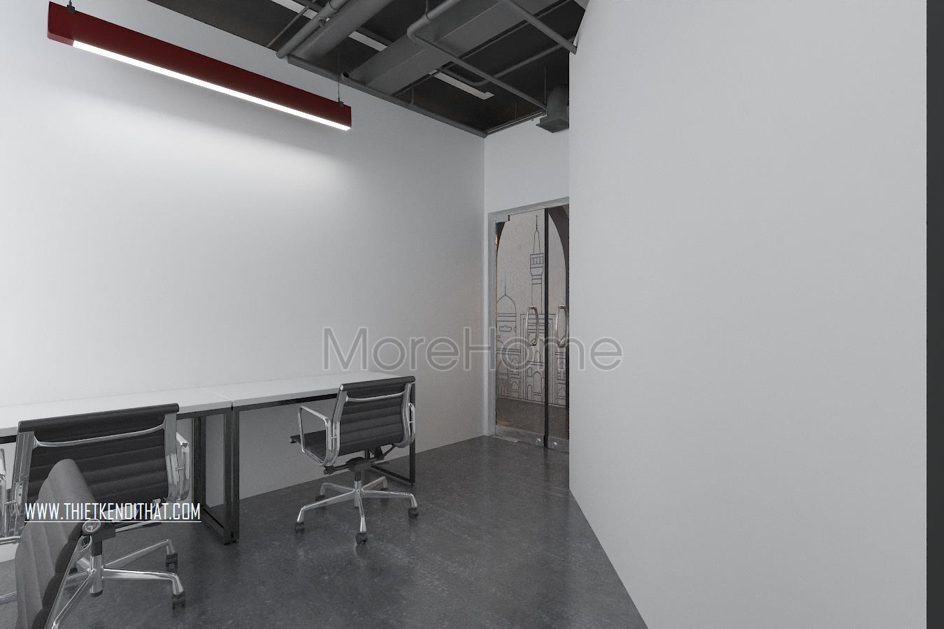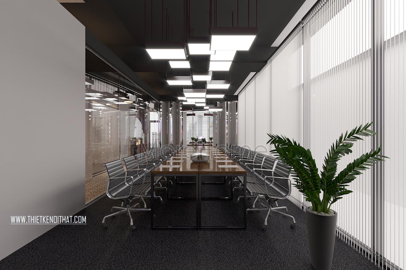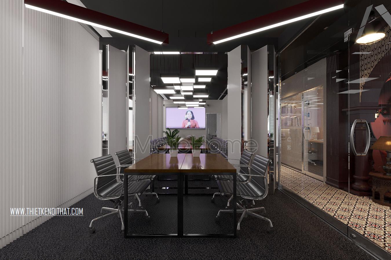 Đây là khu vực chiếm diện tích tương đối lớn của văn phòng này 30m2 với sức chứa 20 người. Không gian phòng họp được thiết kế với hệ thống vách kính cường lực chống ồn, kiến trúc sư muốn sử dụng cửa kính thủy lực để thi công cho khu vực này. Bàn gỗ sồi màu nâu trầm chân thép hiện đại, đơn giản giúp giảm bớt được nhiều diện tích chiếm dụng mặt sàn. Hệ thống đèn trần thiết kế so le cho một không gian có độ sâu trần.