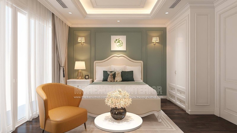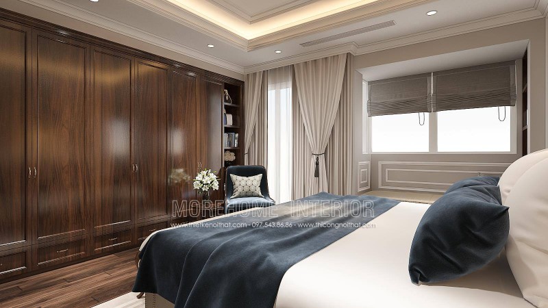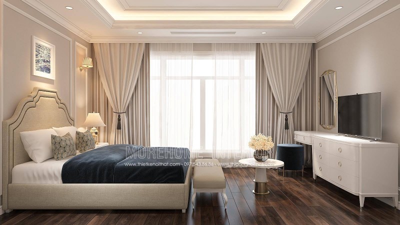 Phòng ngủ nhà tân cổ điển khoảng không gian riêng tư của các thành viên trong gia đình. Màu sắc, họa tiết trang trí được chọn lọc, cân đối tạo nên một tổng thể thống nhất mang dấu ấn cá nhân riêng biệt. Thiết kế cửa sổ rộng rãi mang lại sự thông thoáng hơn cho không gian nghỉ ngơi dễ chịu.