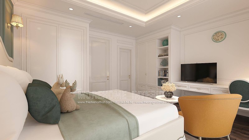 Phòng ngủ thứ 2 với nội thất tân cổ điển được phối hợp giữa màu trắng và xanh của tường tạo nên sự hài hòa về không gian. Đường cong của viền chiếc giường theo lối cổ điển pha với chiếc tủ quần áo lối hiện đại tạo nên sự mới lạ, ấm áp hơn.