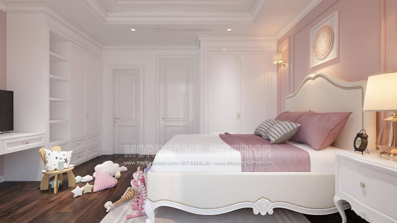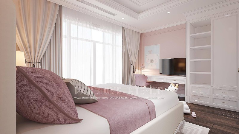Phong cách tân cổ điển trong nội thất phòng ngủ thứ 3 với sự kết hợp của màu trắng, màu hồng phấn giúp diện tích phòng rộng rãi hơn và tinh tế hơn. Trang trí kệ để vật dụng bạn yêu thích là môt ý tưởng hay mà KTS mang lại. Chiếc thảm với họa tiết hoa văn tạo điểm nhấn.