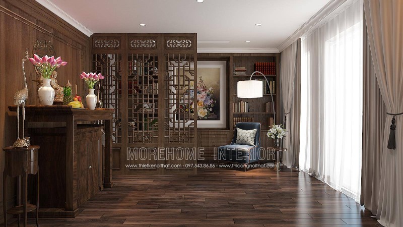 Thiết kế phòng thờ tôn nghiêm với chất liệu gỗ. Vách ngăn gỗ mang đến sự riêng biệt cho không gian thờ cúng, bàn thờ gỗ tự nhiên với gam màu trầm mang đến sự thân thiện và trầm. Một không gian đọc sách tĩnh lặng ngay cạnh phòng thờ với kệ sách và chiếc đôn sofa mang đến phút thư giãn yên bình cho gia chủ.