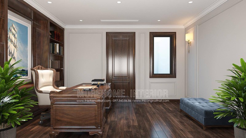 Một không gian nữa trong ngôi nhà phố này là không gian làm việc. Được thiết kế tiện ích với mẫu bàn ghế bằng gỗ tự nhien đồ sộ kết hợp kệ trang trí âm tường mang đến sự tiện nghi cho gia chủ.