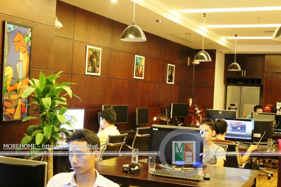 Tính từ cửa ra vào, dãy bên tay phải là 4 dãy bàn làm việc với các bàn quay mặt và quay lưng vào cửa. Có dãy bàn có 2 người ngồi quay mặt vào nhau và được ngăn cách bởi máy tính làm việc nhưng cũng có bàn chỉ có 1 người ngồi. Sự sắp xếp này tùy thuộc vào tính chất công việc, diện tích bàn hoặc nhiều yếu tố khác… Những bức tranh dán trực tiếp lên phòng cùng chậu cây xanh mát mẻ là điểm nhấn tạo sự mới mẻ, trẻ trung và thoải mái của văn phòng làm việc nơi đây. Hệ thống đèn trang trí trong phòng làm việc không chỉ bắt mắt mà còn có ánh sáng hợp lý, phù hợp, đảm bảo có lợi cho thị giác của ngưởi dùng.
