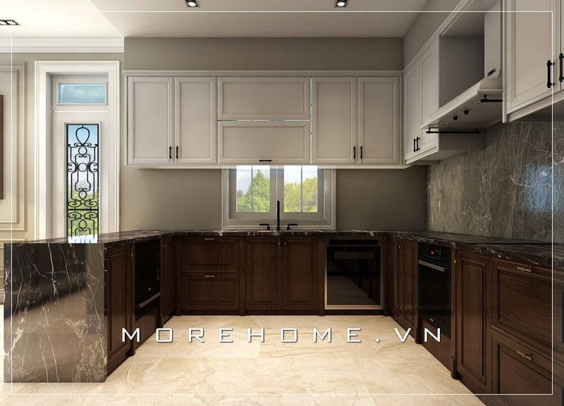 Thiết kế nội thất phòng bếp biệt thự tân cổ điển sang trọng, sử dụng tone màu trắng chủ đẹp cho căn bếp mang đến sự nhẹ nhàng, tinh tế và không gian tiện nghi