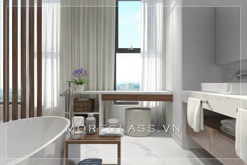 Mẫu thiết kế phòng tắm cho cư dân cao cấp sử dụng đồ nội thất hiện đại và tông màu trắng tinh tế sang trọng.