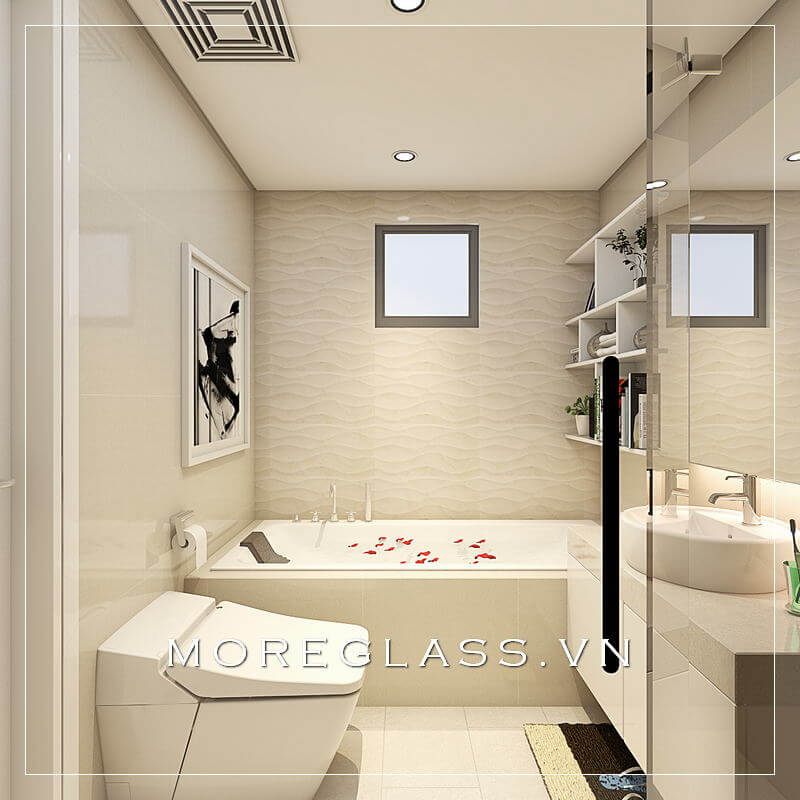 Mẫu thiết kế phòng tắm nhỏ gọn với bồn tắm cao cấp, nội thất và thiết bị vệ sinh được giản điểu.