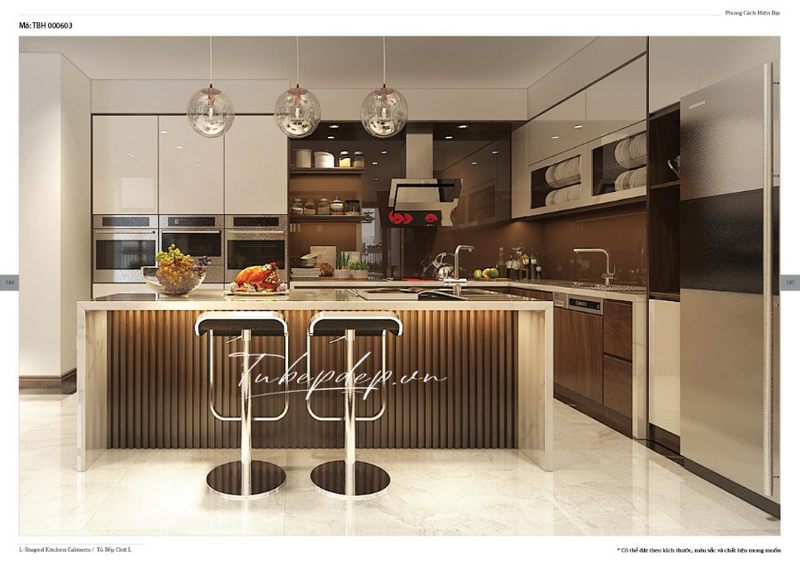 Một mẫu thiết kế phòng bếp tân cổ điển được tạo ra bằng cách kết hợp sáng tạo giữa tủ bếp chữ L trên và tủ dưới chữ U từ gỗ óc chó, mang lại sự sang trọng và tiết kiệm không gian, có thể cất trữ được nhiều đồ hơn.