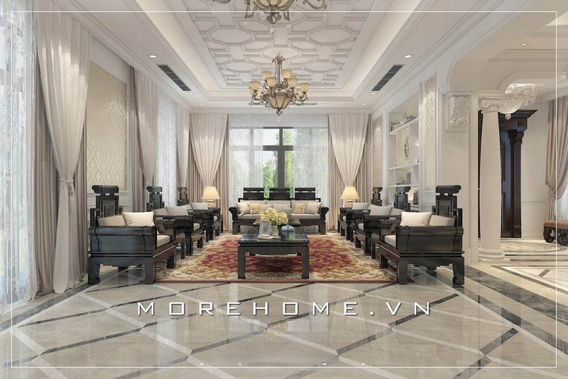 Bố trí nội thất phòng khách biệt thự gỗ tự nhiên cao cấp phong cách tân cổ điển sang trọng thể hiện cá tính đẳng cấp của gia chủ