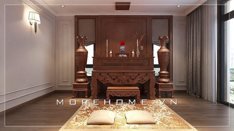 Mẫu bàn thờ cao cấp có hơi thở của truyền thống với đường nét uốn lượn tinh tế kết hợp với đôi bình phong gỗ tạo nên không gian phòng thờ sang trọng và đẳng cấp.