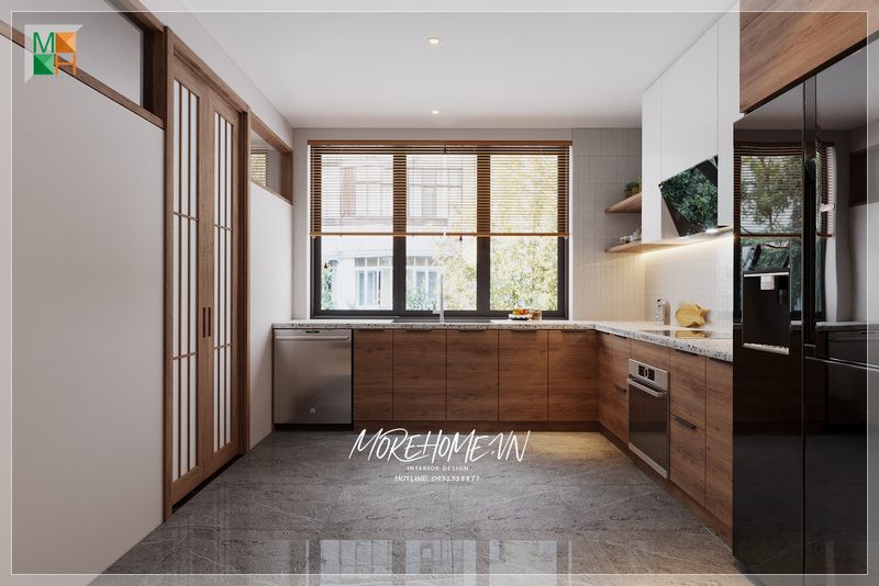 Phòng bếp nhà phố được thiết kế theo phong cách hiện đại và đơn giản, cung cấp những tính năng hỗ trợ tốt cho quá trình sử dụng nấu nướng của người nội trợ.