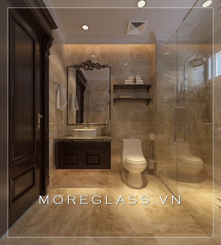 Phòng tắm hiện đại có một kệ tủ lavobo gỗ tự nhiên nhỏ gọn màu nâu trầm, gương tròn để trang trí, vách tắm kính đẹp và các thiết bị vệ sinh cao cấp.